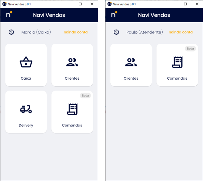 O Navi Vendas possui 3 perfis para o cadastro de um usuário: