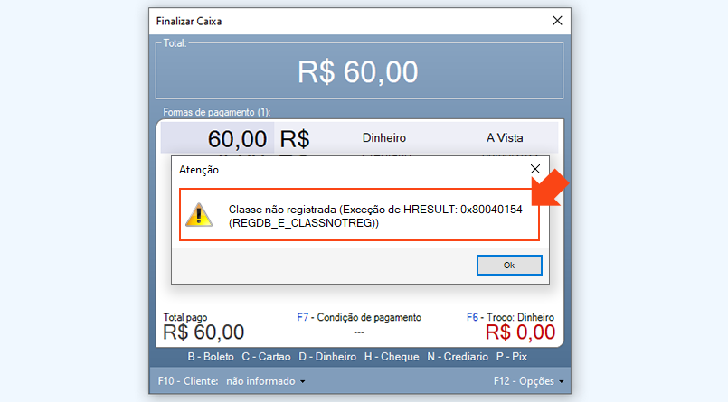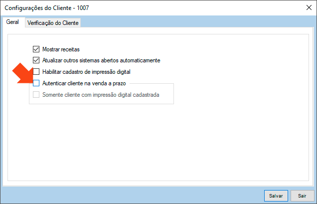 Causa: Ocorre quando é realizada uma venda a prazo no “Caixa”, enquanto que, no módulo “Configurações do Cliente - 1007” a opção “Autenticar cliente na venda a prazo” está habilitada. A opção “Autenticar cliente na venda a prazo” serve para quem utiliza leitor biométrico.
