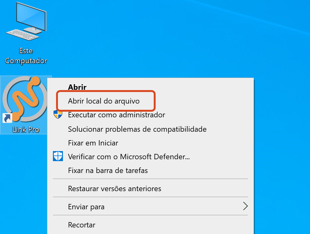 - Na área de trabalho, clique com o botão direito do mouse sobre o ícone do sistema Link e escolha a opção Abrir local do arquivo.