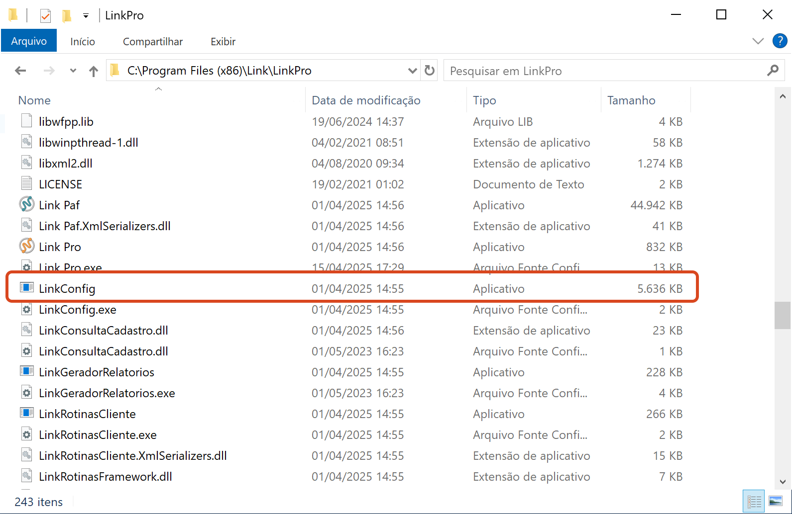 Observação: Esse atalho nos leva para a pasta de instalação do sistema Link em “C:\Arquivos de Programas (x86)\Link\LinkPro”.