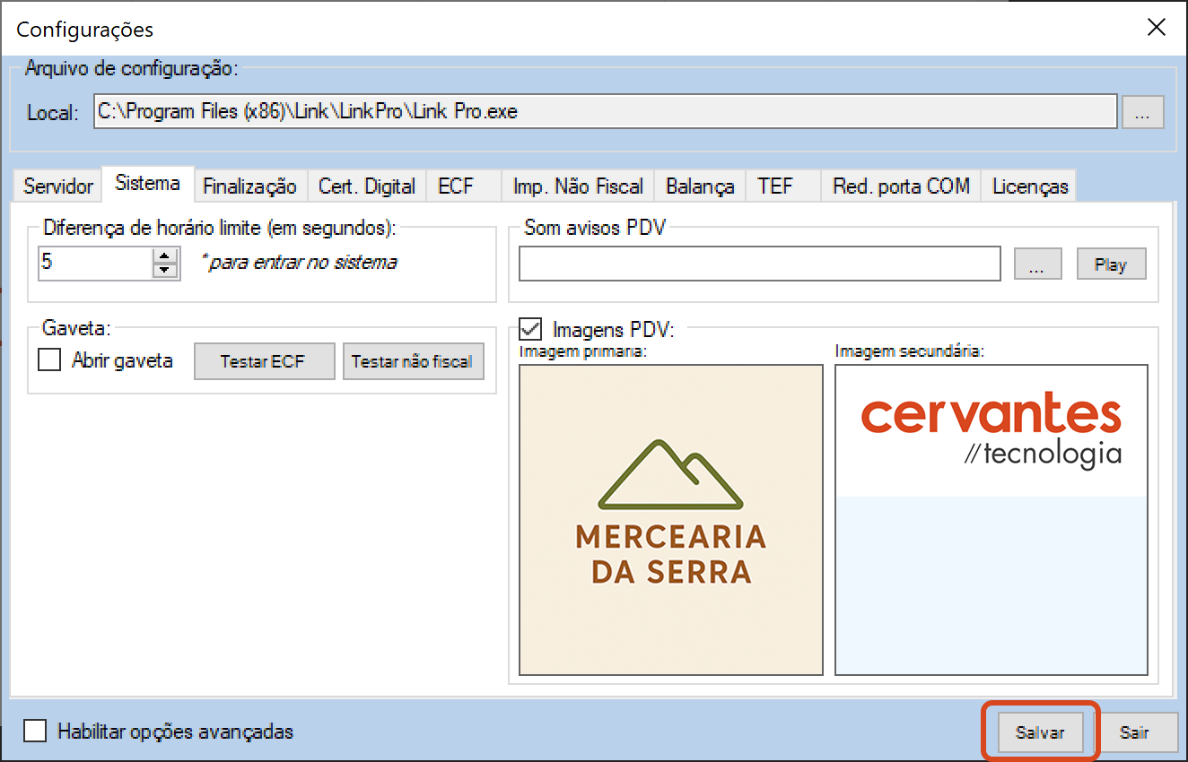 Importante: Caso queira conferir como ficou na tela do Caixa, é preciso clicar em Salvar e reiniciar o sistema Link.