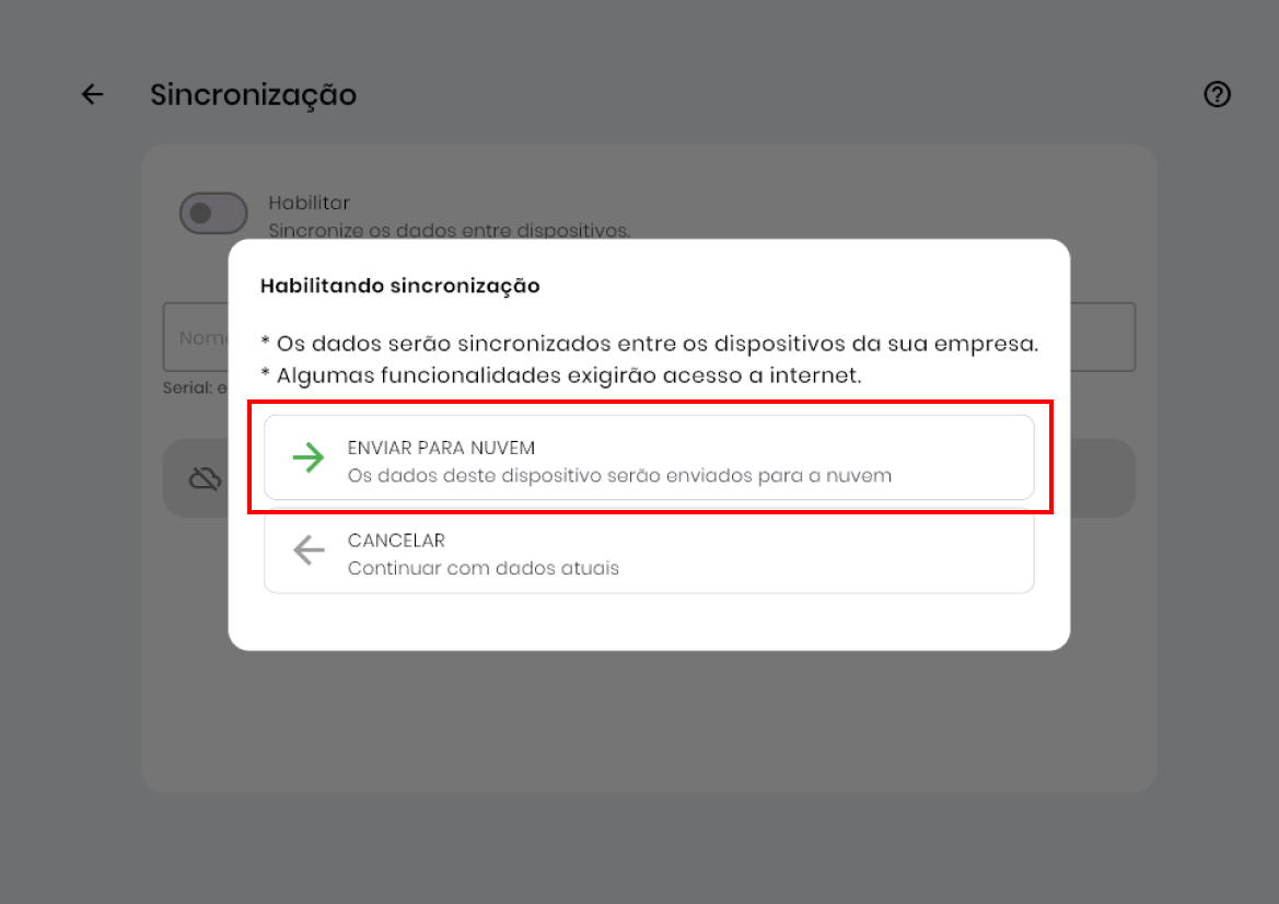 - Na janela que abriu, clique na opção Enviar para nuvem para que os dados neste dispositivo sejam lançados para a nuvem.