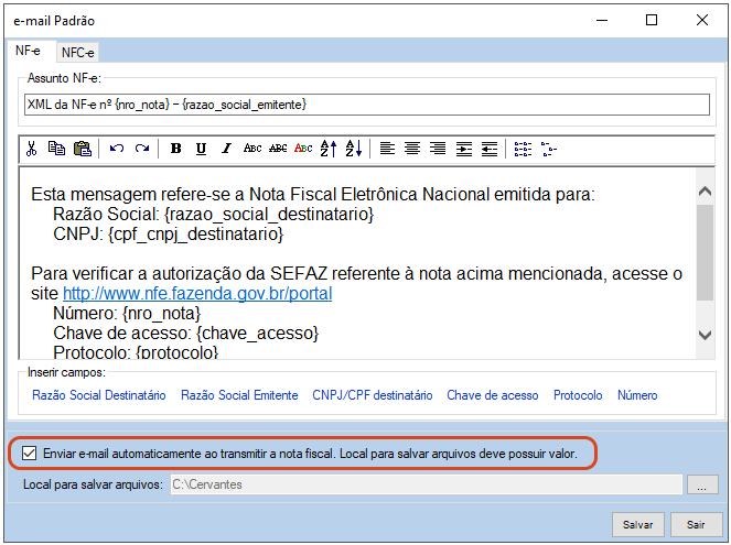 Observação: O sistema já traz um modelo de e-mail padrão, que pode ser editado tanto para NF-e quanto para NFC-e. Aqui é possível alterar: