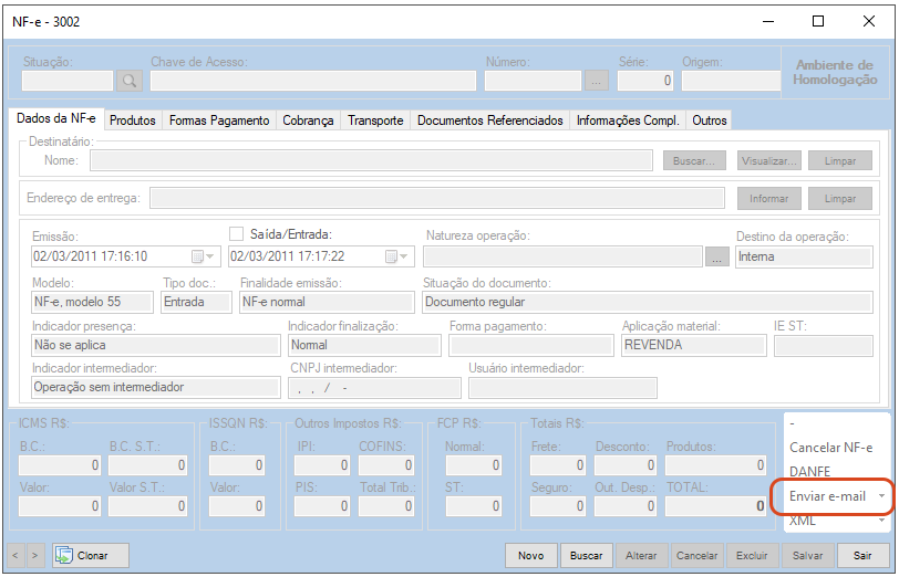 - De volta à tela com a NF-e, clique em Enviar e-mail > NF-e Autorizada.