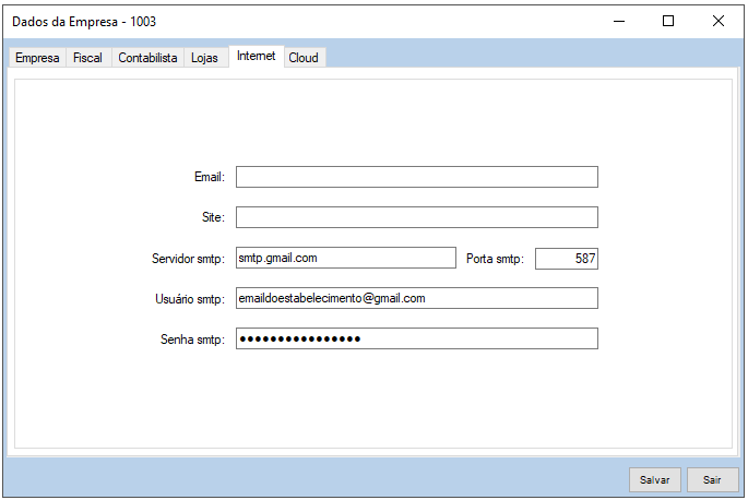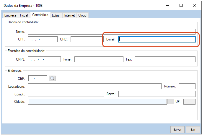 - Preencha o campo E-mail com o endereço de e-mail da Contabilidade.