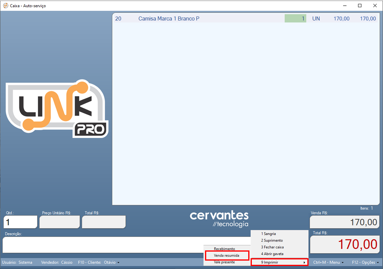 - Clique em Imprimir e selecione a opção Venda resumida.