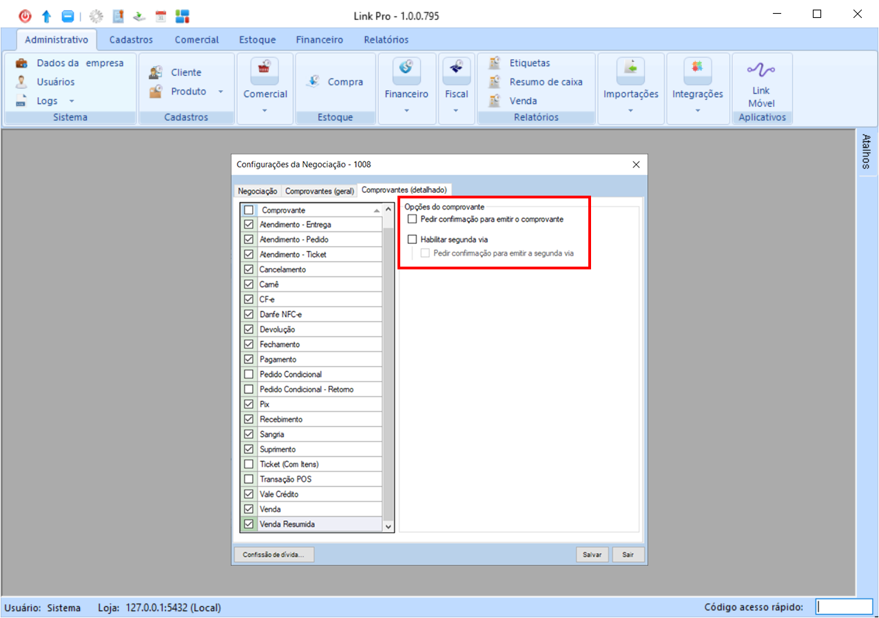 - Para emitir uma segunda via da “Venda Resumida”, marque a opção Habilitar segunda via.
