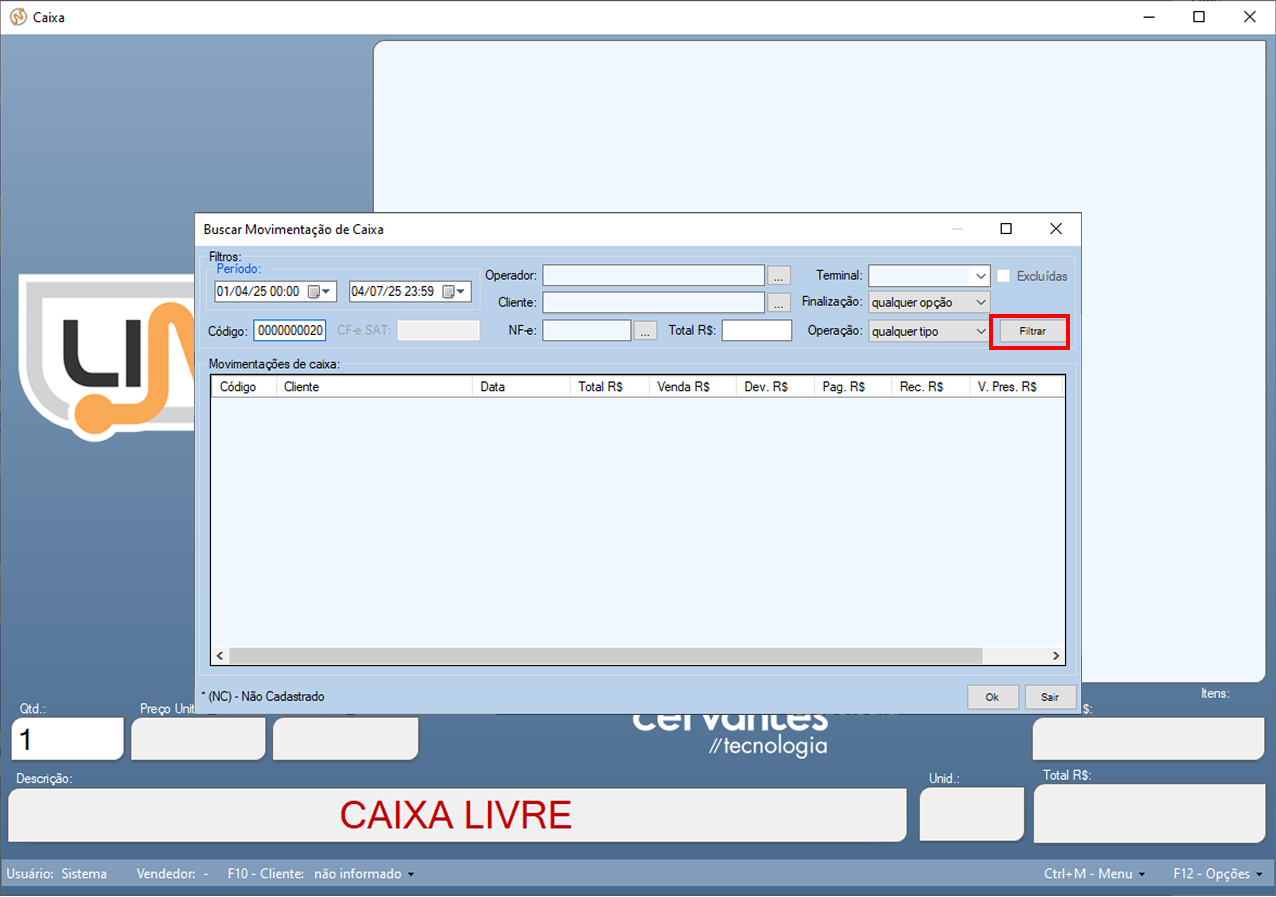 - Utilize os filtros para localizar a venda desejada e clique em Filtrar.