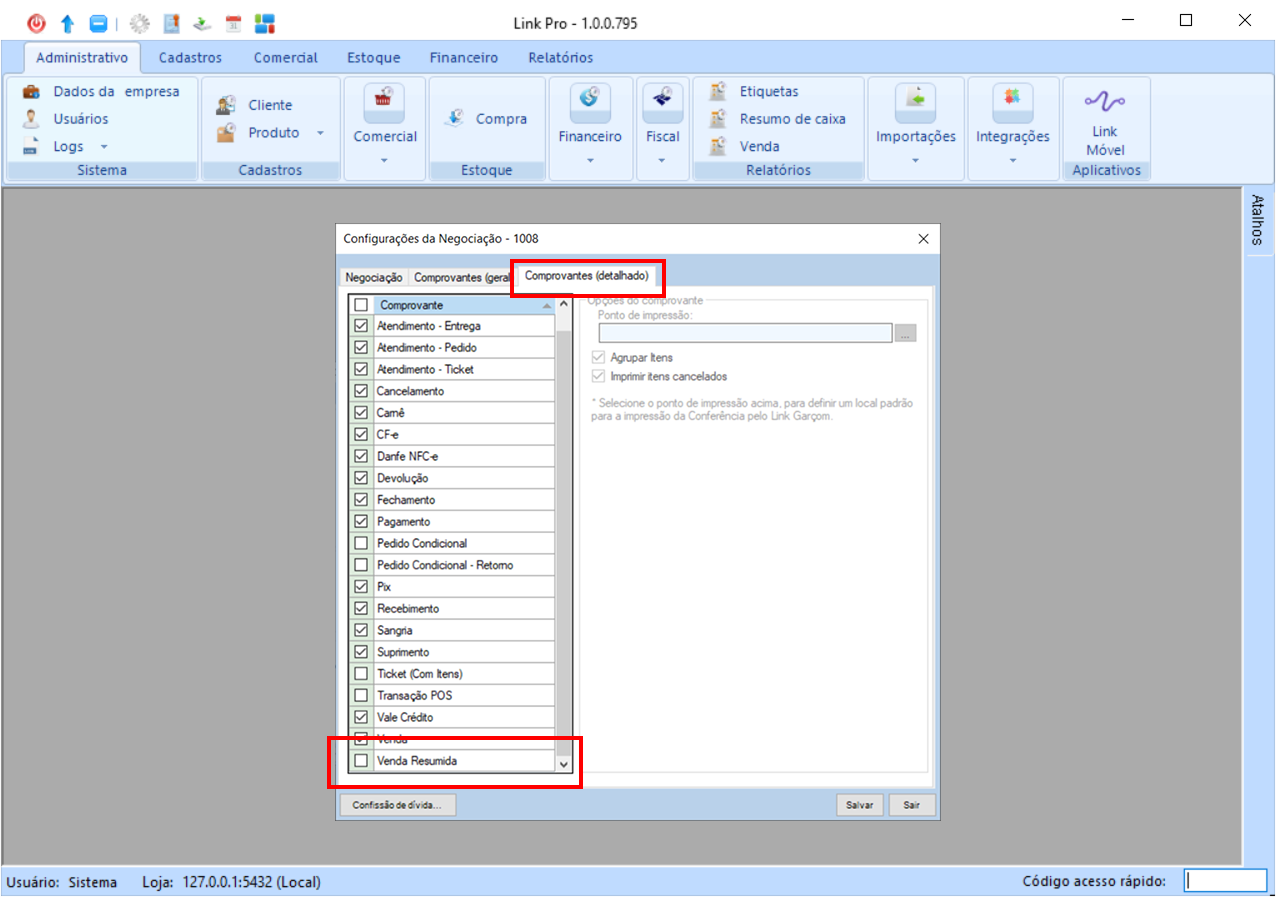 - Clique na aba Comprovantes (detalhado) e marque a opção Venda Resumida.