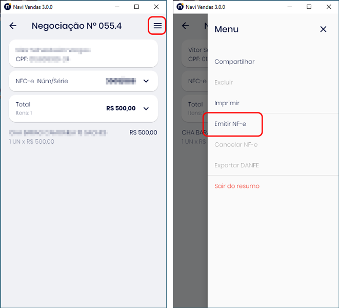 3. Na tela da negociação escolhida, vá ao menu superior direito e clique em Emitir NF-e.