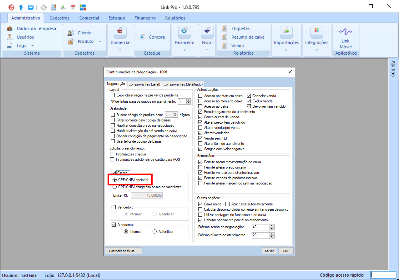 - Para que sempre haja uma solicitação opcional de CPF/CNPJ na nota fiscal ao finalizar a venda, selecione a opção CPF/CNPJ opcional.