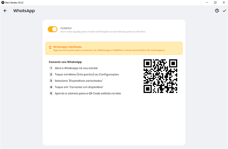 - Caso utilize o Navi Vendas em mais de um dispositivo, defina qual receberá os pedidos usando o seletor ao final desta tela.