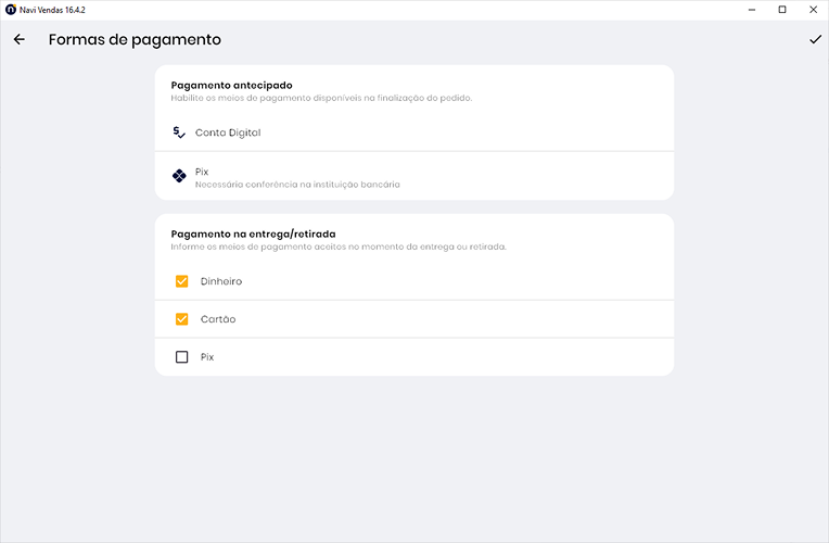 As formas habilitadas em pagamento na entrega/retirada aparecerão no Catálogo, mas elas são apenas informativas. Servem tanto para mostrar ao cliente quais são as formas de pagamento aceitas pelo estabelecimento quanto para o estabelecimento saber qual foi a forma que o cliente escolheu para pagar.