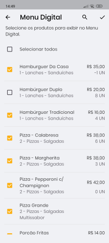 Os produtos cadastrados no sistema são listados nesta tela. Selecione apenas os que deseja vender através do Menu Digital.
