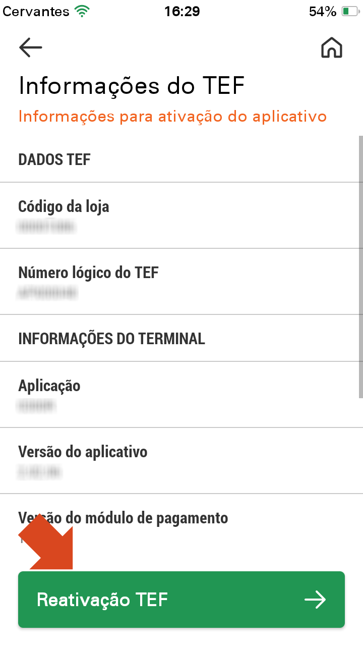 8. Na tela de “Informações do TEF” pode aparecer o botão Cadastro TEF ou Reativação TEF, clique conforme aparece no seu dispositivo.