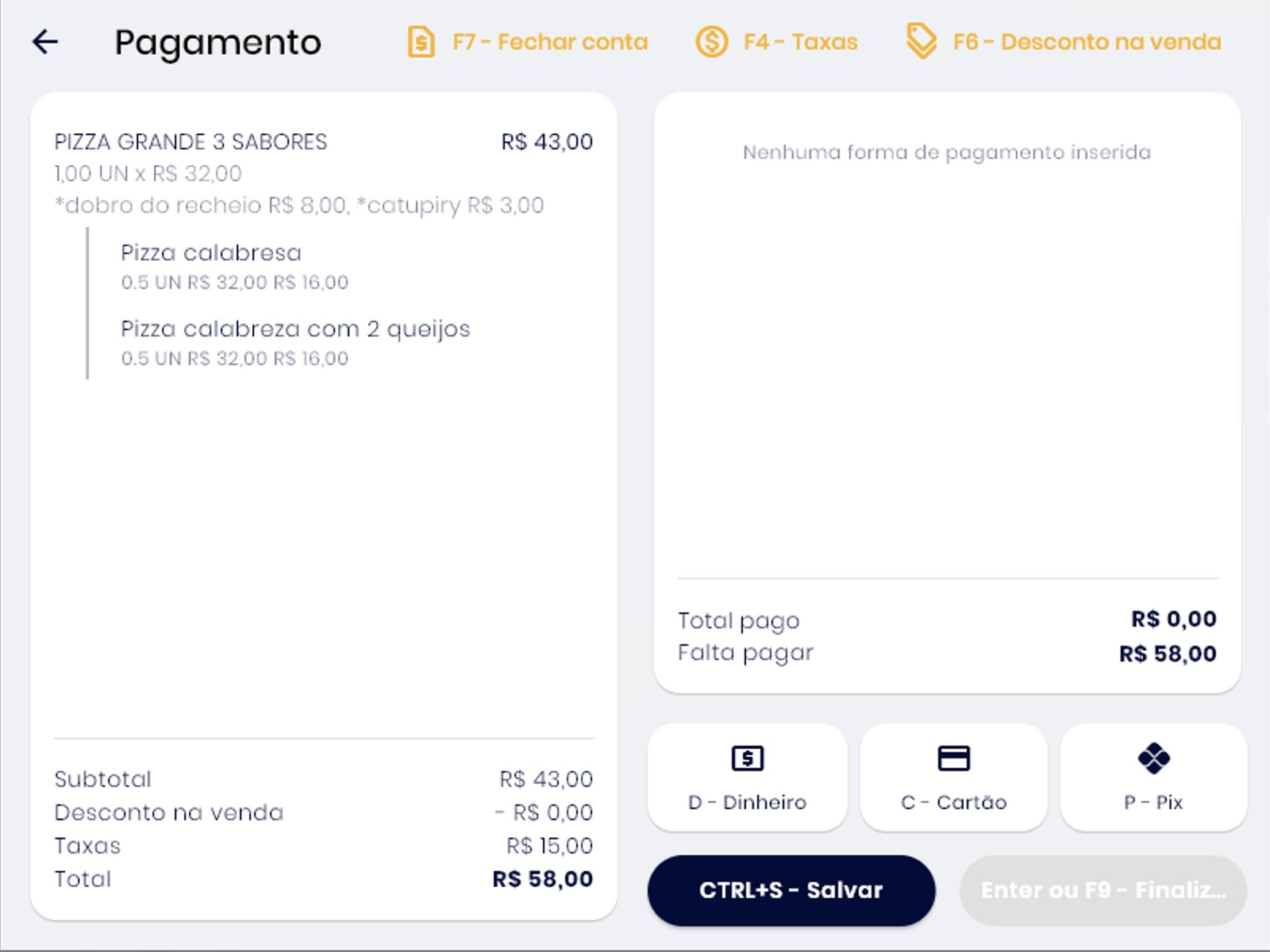 Você pode adicionar várias formas de pagamento e definir um valor diferente para cada uma. Para isso, adicione a forma de pagamento, altere o valor e, ao adicionar a próxima, o sistema informará o valor faltante.