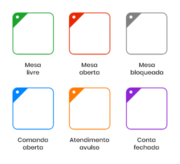 Abaixo listamos a legenda de cores utilizadas para identificar mesas, comandas e suas situações.
