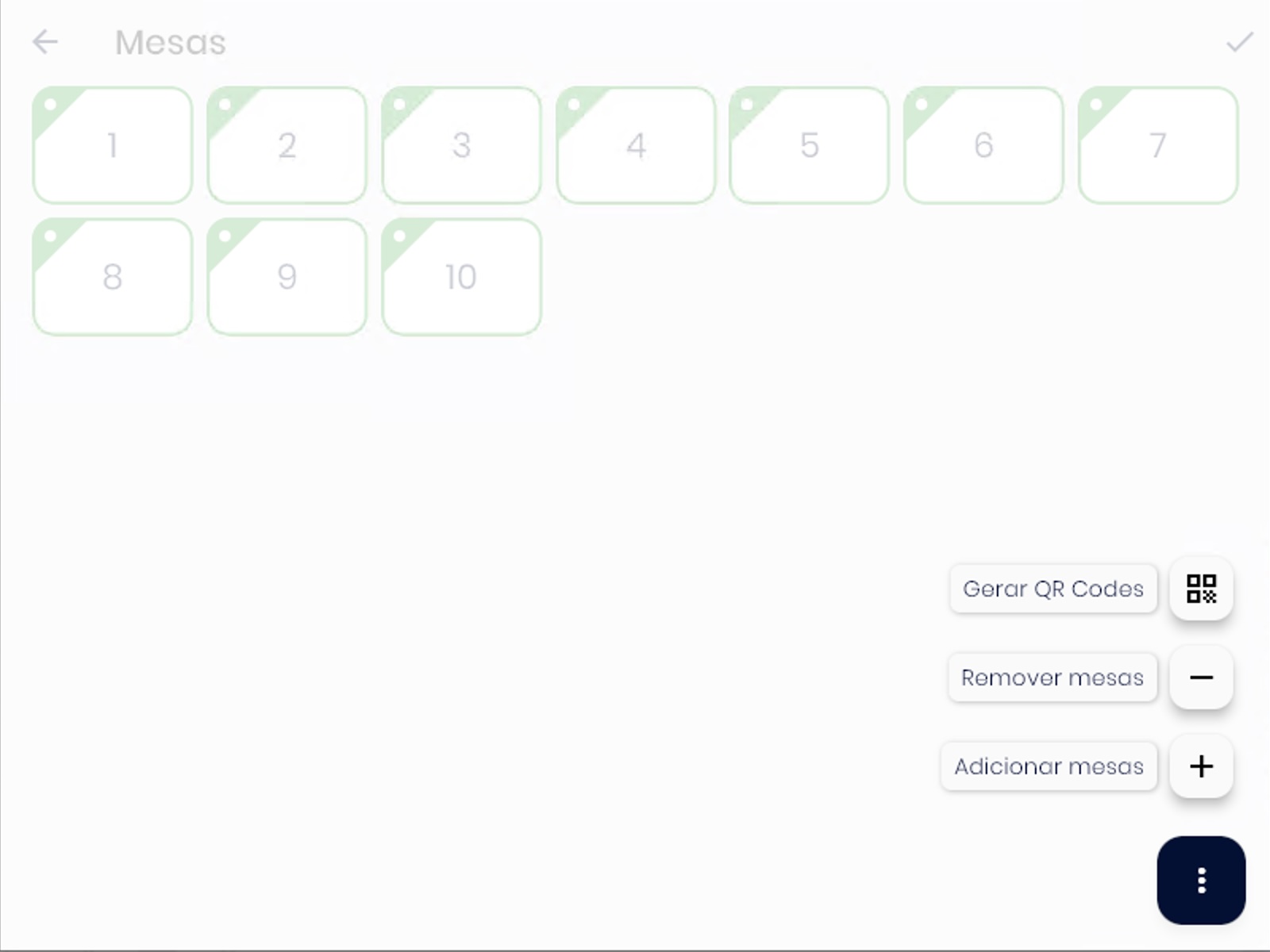 Após adicionar as mesas/comandas, ficará liberado o menu de Opções (ícone de 3 pontos verticais). Nele, ficam as opções: