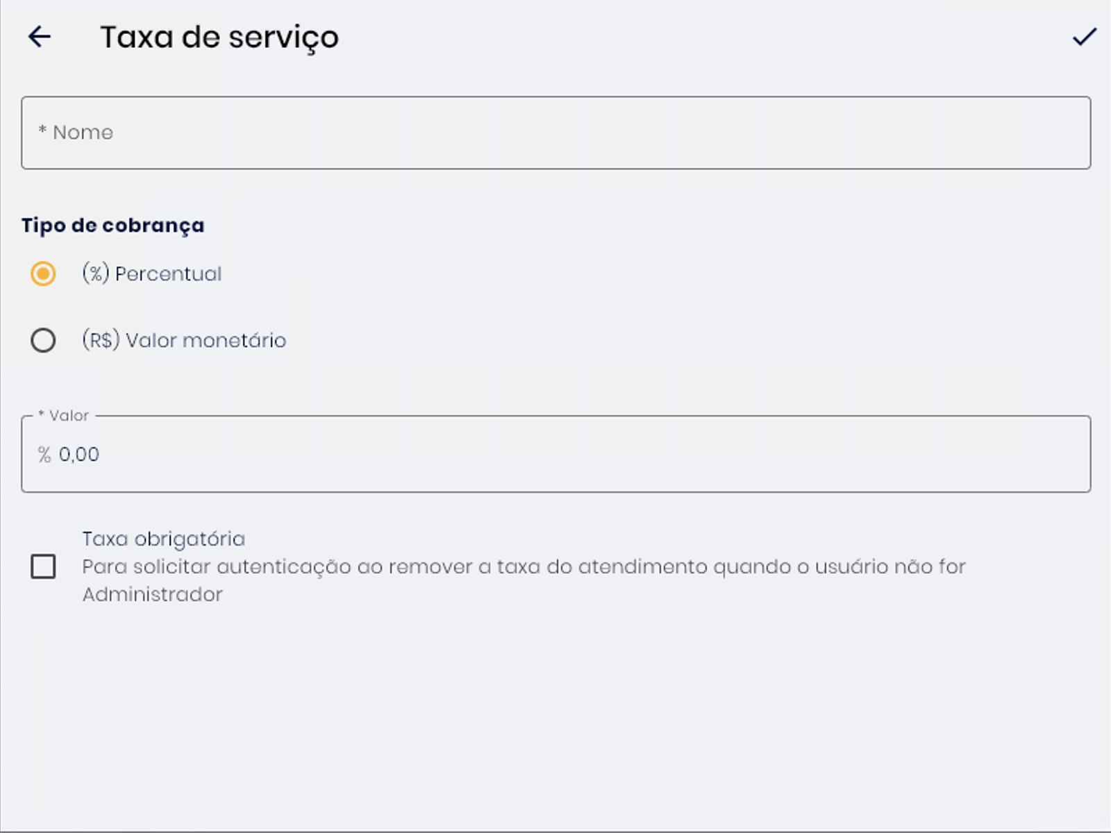 Se a taxa for opcional, ela será adicionada no pedido da mesa/comanda automaticamente, mas poderá ser removida na tela de pagamento.