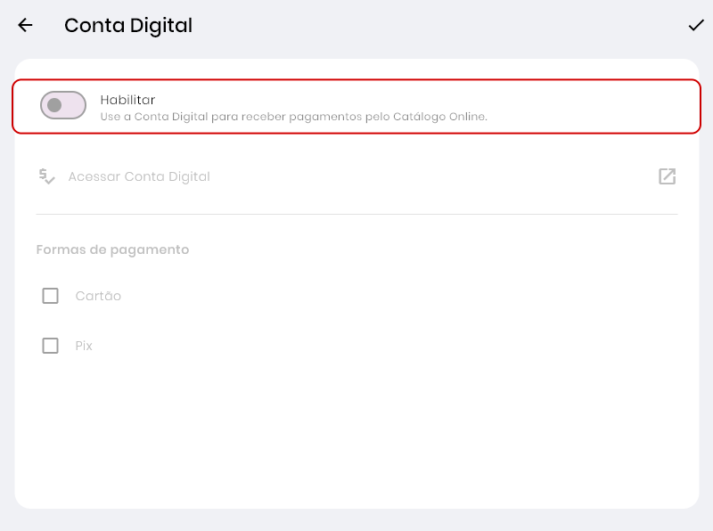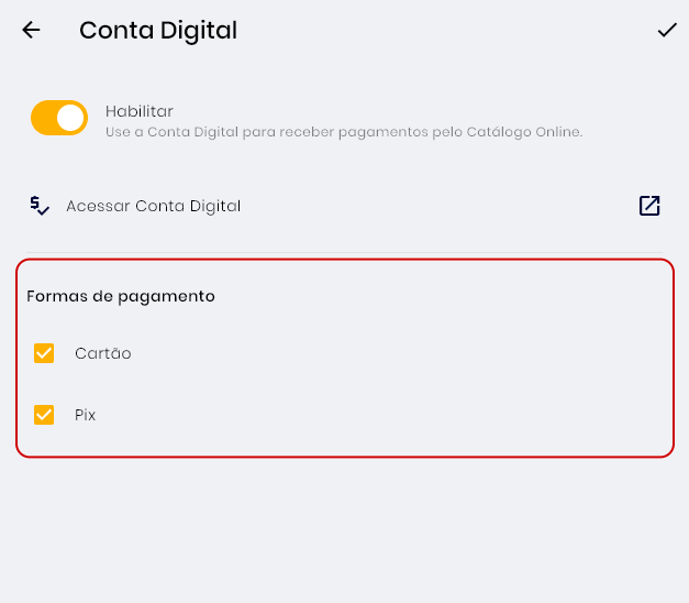 - Habilite as formas de pagamento que deseja disponibilizar para o cliente no Catálogo, seja Cartão de crédito, Pix ou ambas. Ao menos uma das formas precisa estar habilitada.
