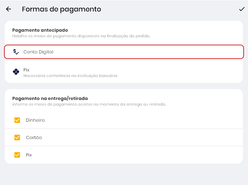 Na tela Formas de pagamento, clique sobre o título Conta Digital.
