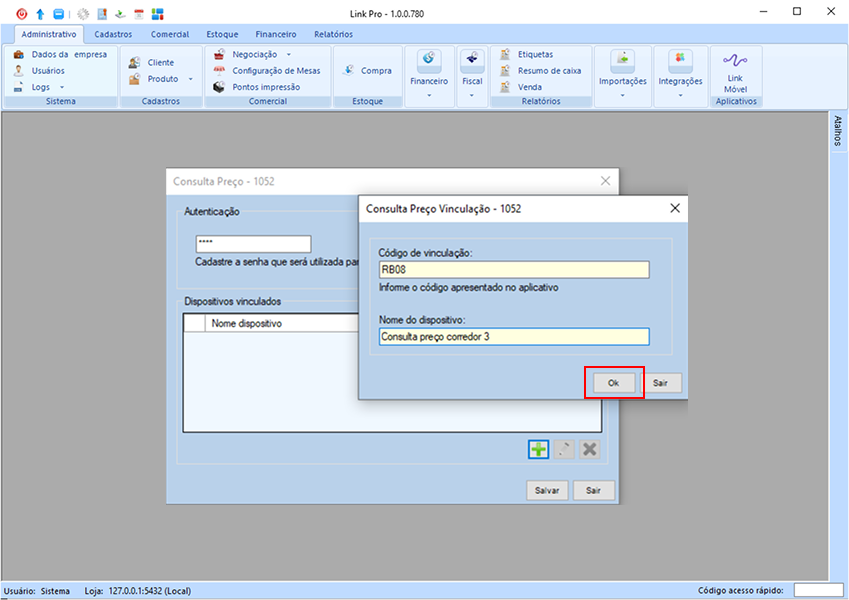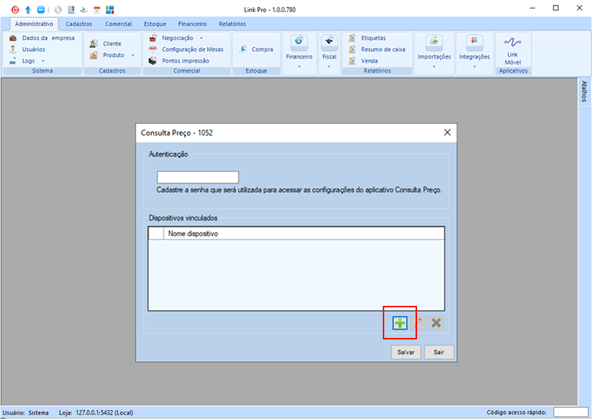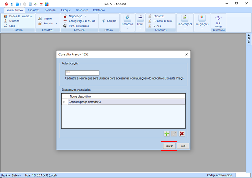 Na janela que abrir, informe a senha definida nas configurações do Consulta Preço no Link.