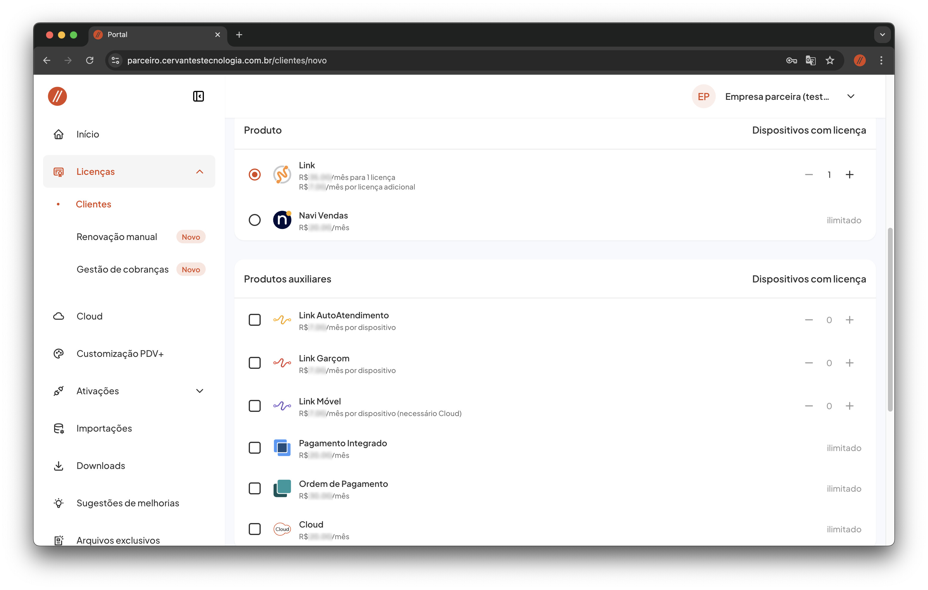 A contratação de produtos auxiliares é feita através do Portal do Parceiro e a gestão das licenças se encontra na tela de cadastro de Clientes.