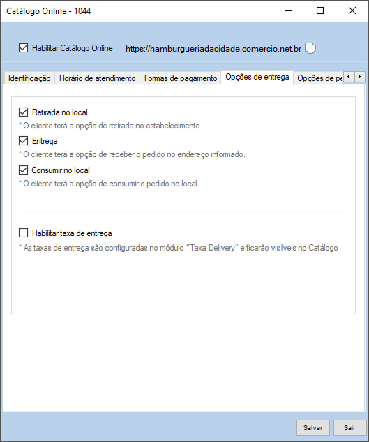 Se desejar, habilite Taxas de entrega. As taxas utilizadas são as configuradas no módulo Taxa Delivery - 1034. Confira o tutorial de Taxas de entrega no Catálogo Online.