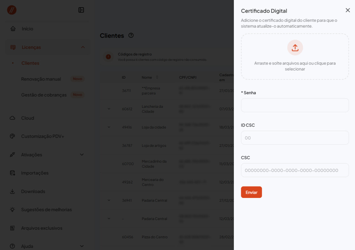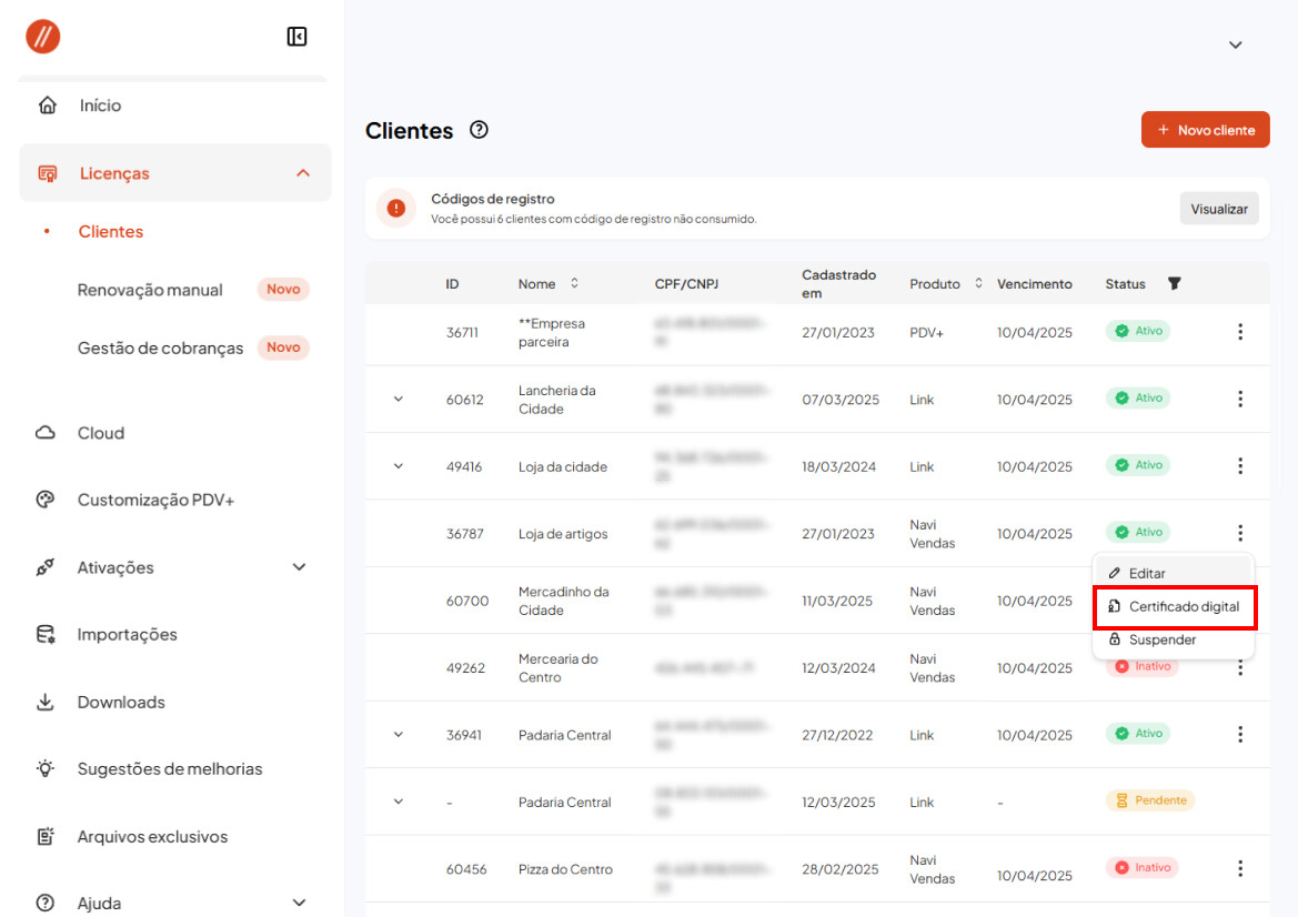 O Certificado Digital pode ser configurado para todos os seus clientes Navi Vendas/PDV+ através do Portal do Parceiro.
