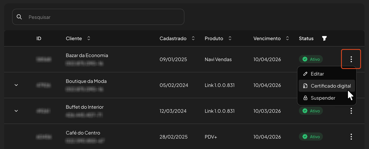 Clique no menu (3 pontos) ao lado do cliente e selecione a opção Certificado digital