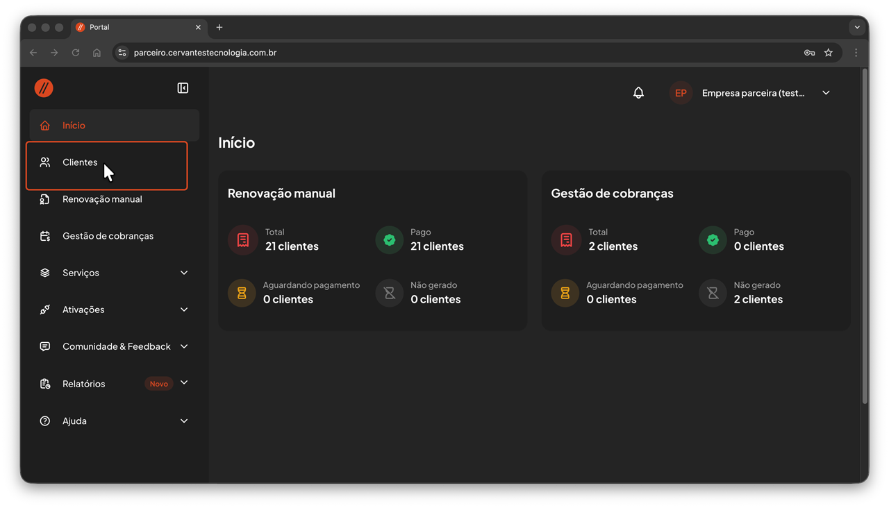 No menu lateral, clique em Clientes.