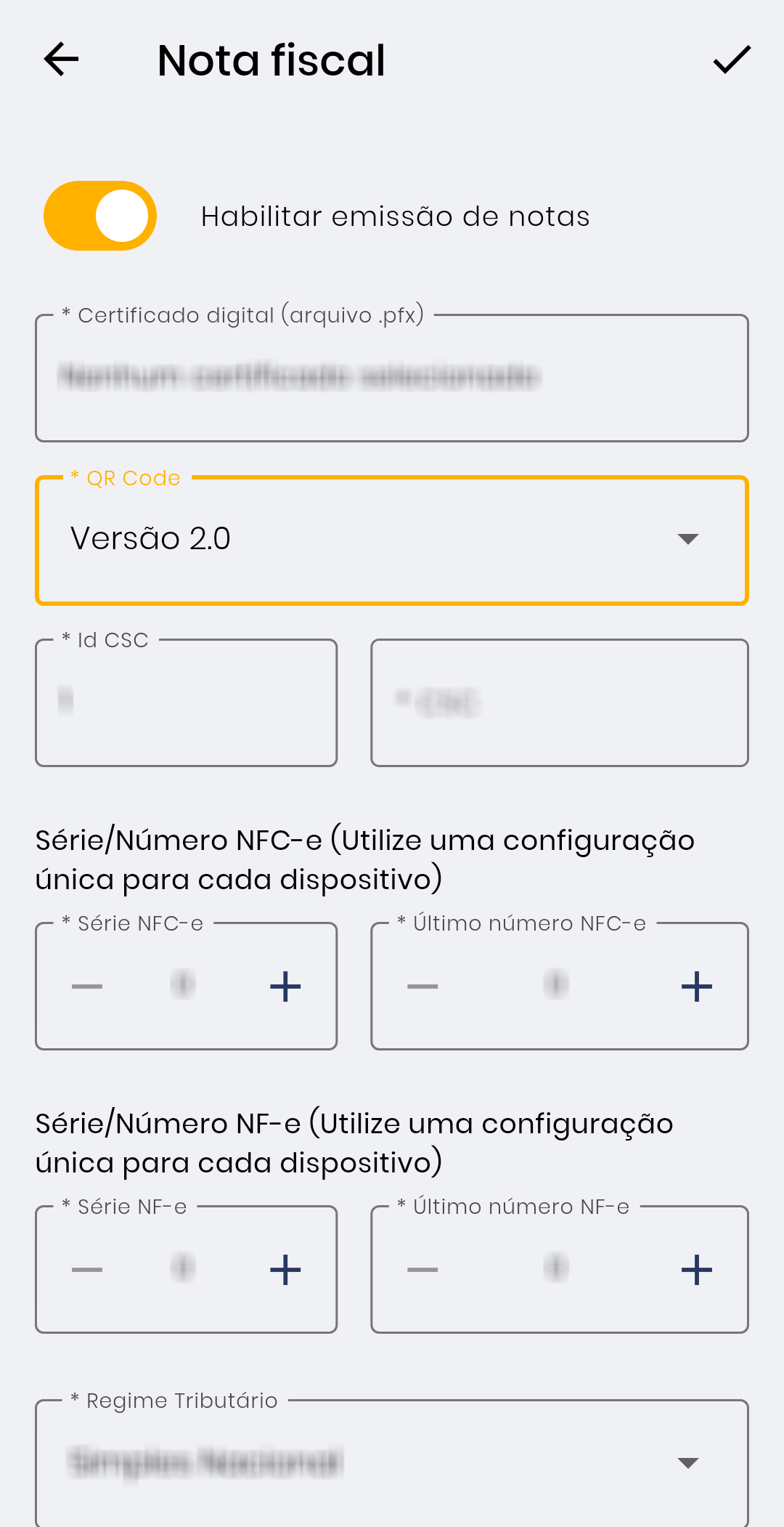 Selecione a versão do QR Code, “2.0” ou “3.0”. Na versão 2.0, aparecerão os campos de “Id CSC” e “CSC”.