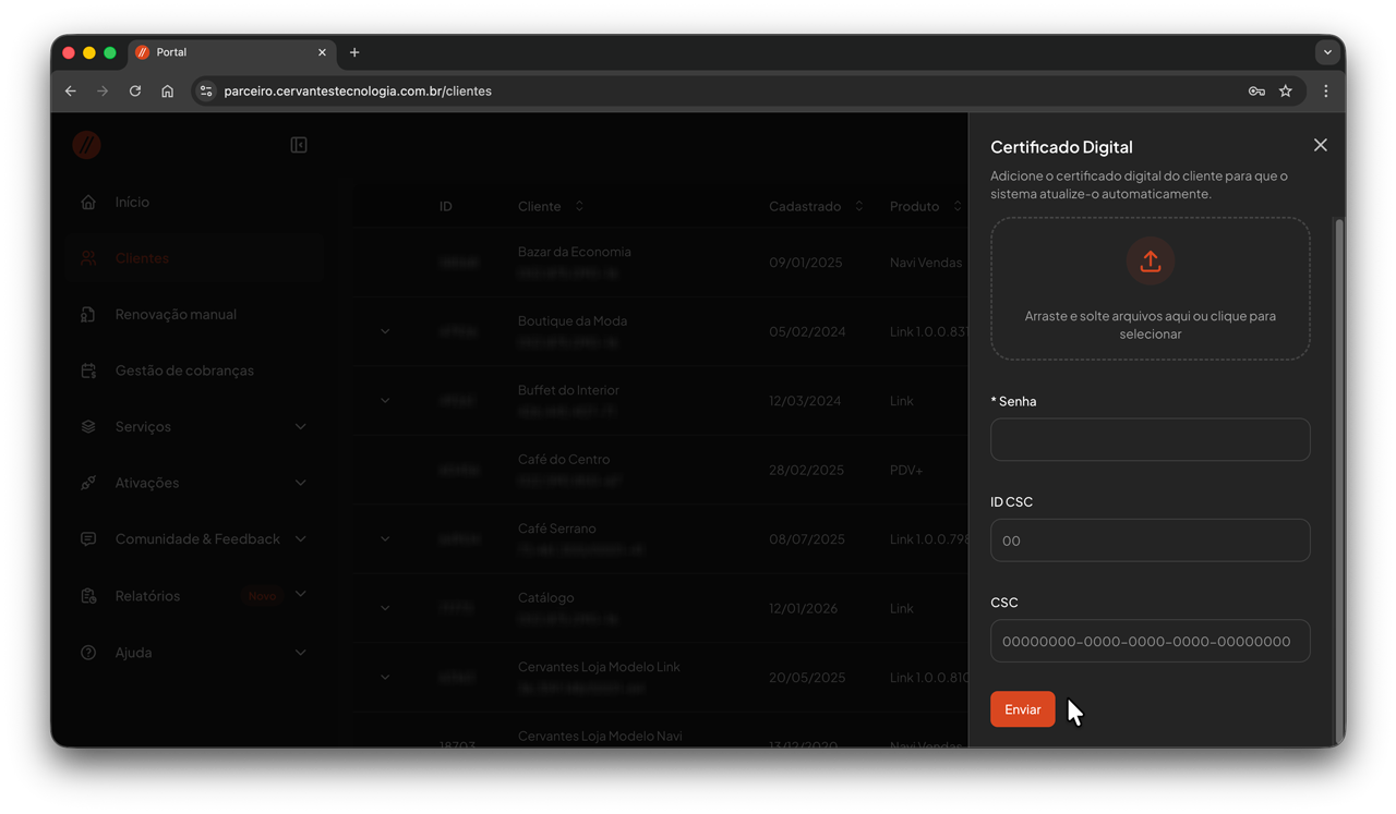 O Certificado Digital pode ser configurado para todos os seus clientes Navi Vendas/PDV+ através do Portal do Parceiro: