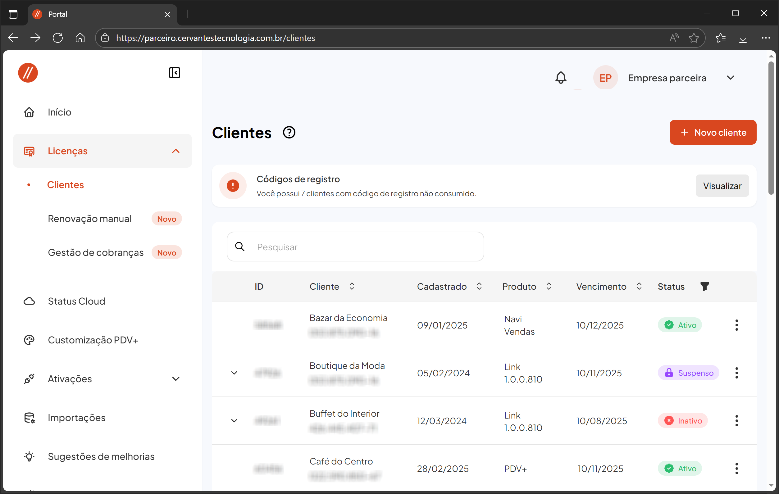 Acesse o Portal do Parceiro e clique no menu Licenças.