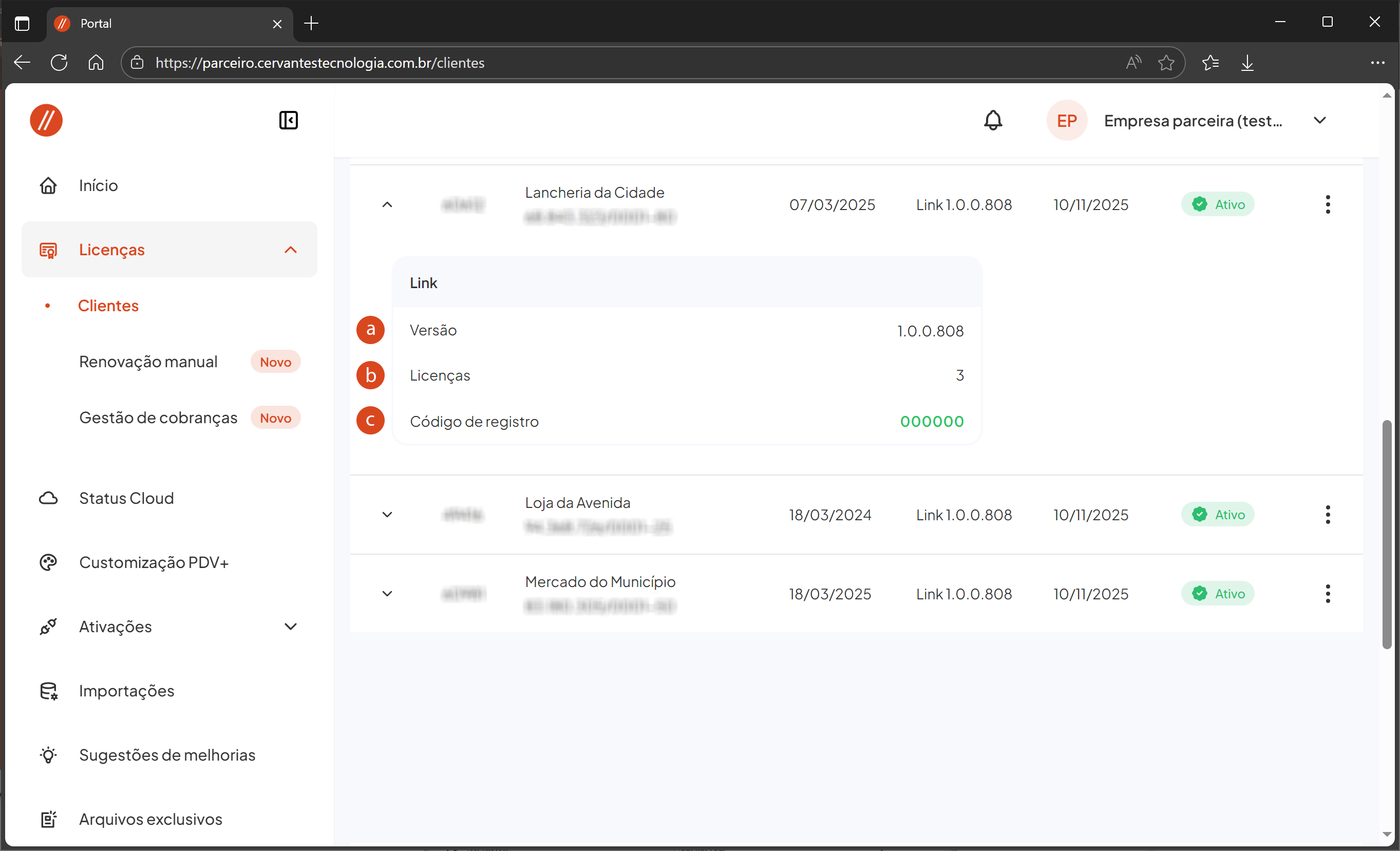 b. Licenças: Quantidade de licenças deste cliente.