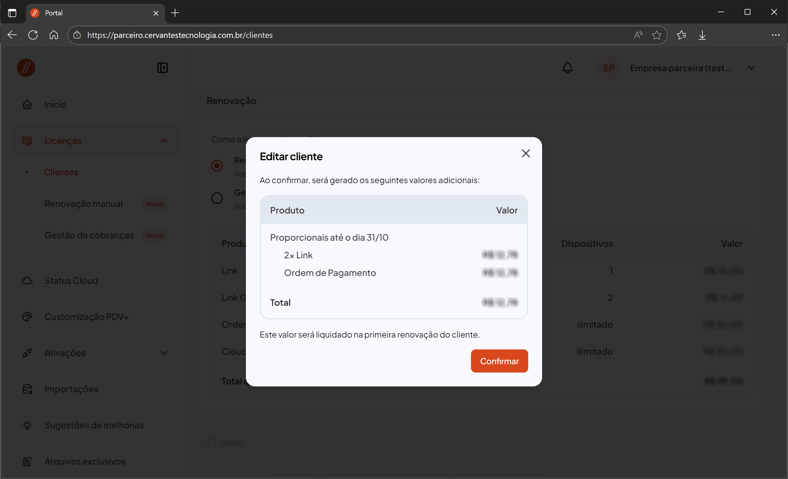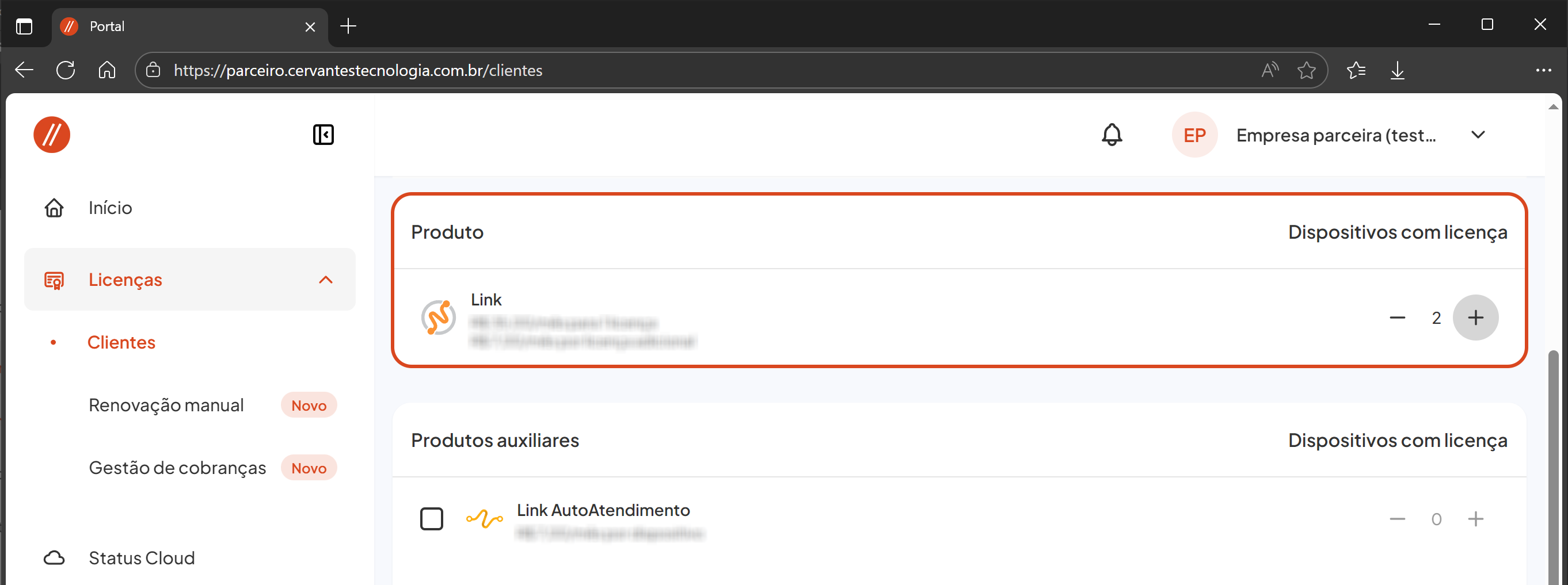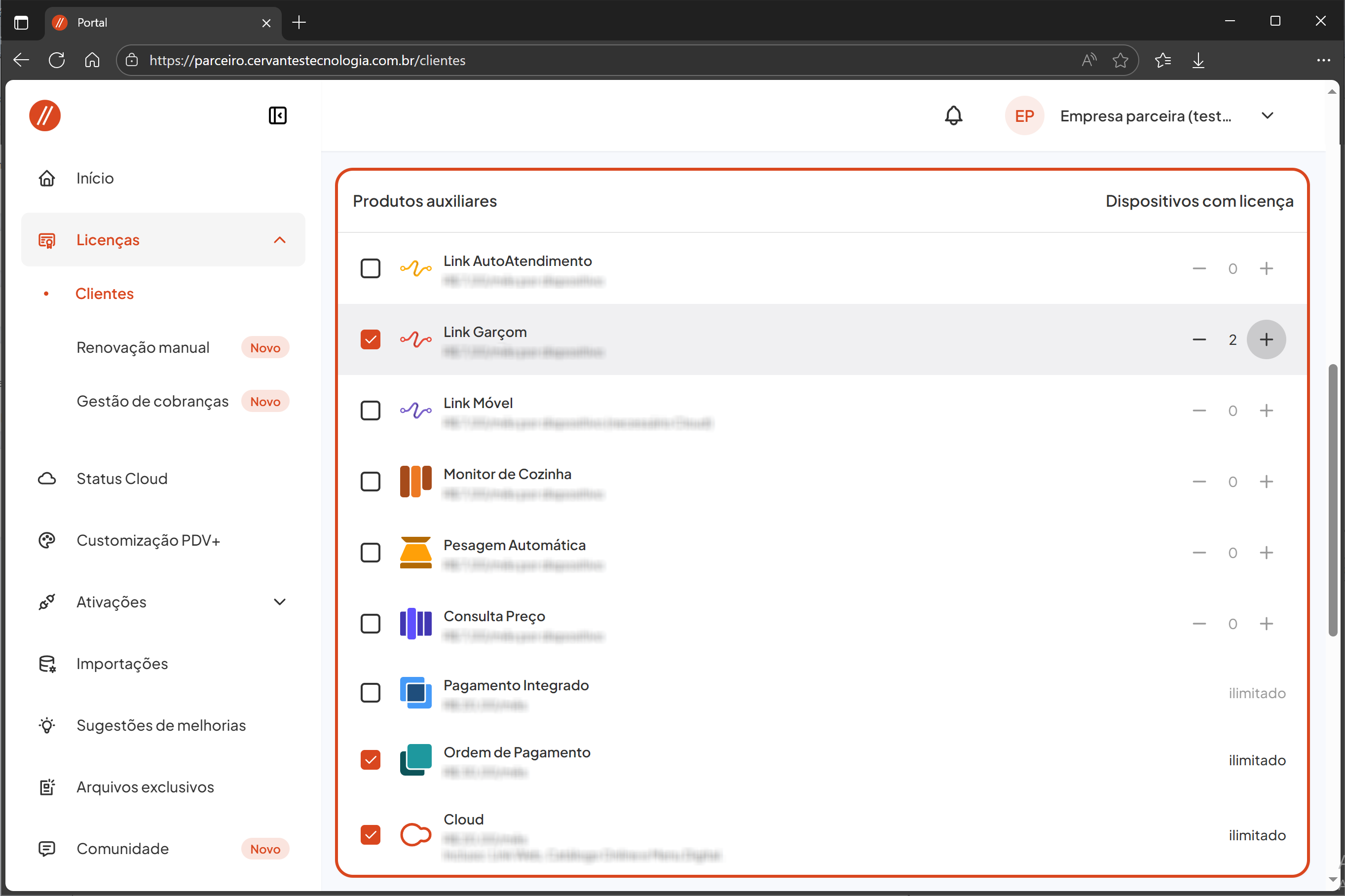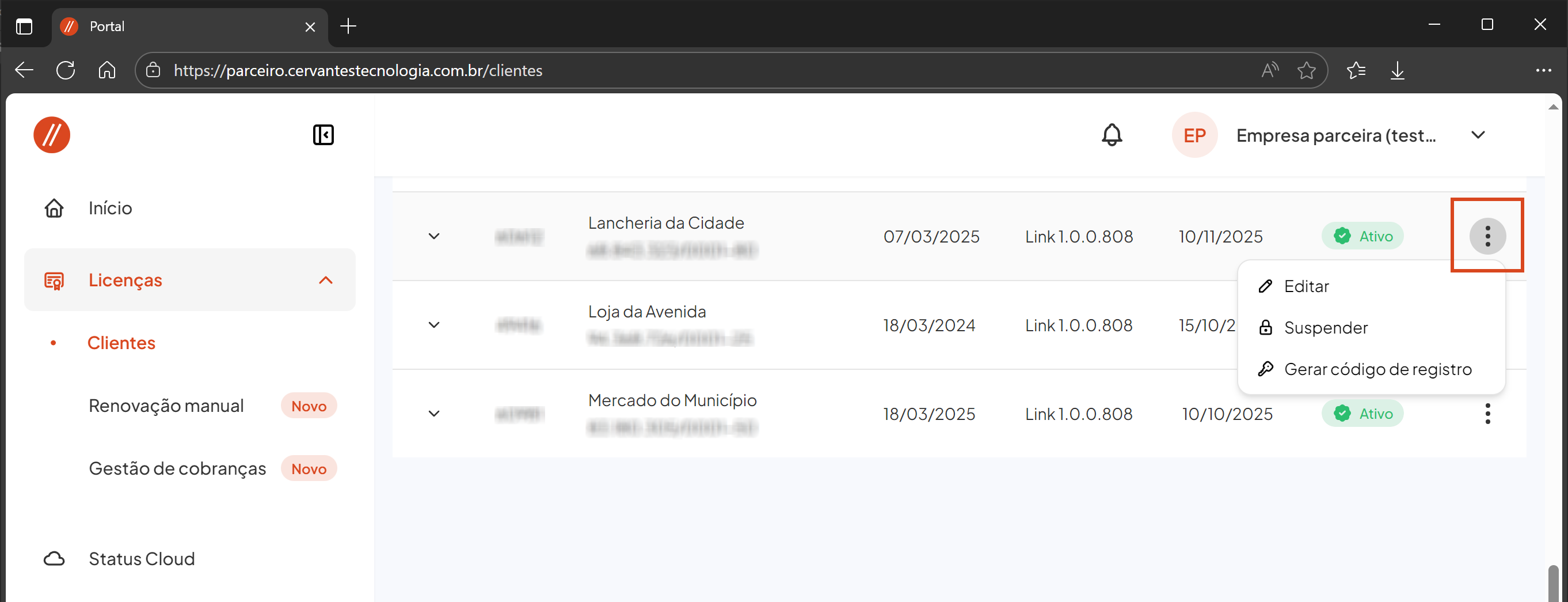 Dentro do Portal do Parceiro, clique em Licenças e acesse a opção Clientes.