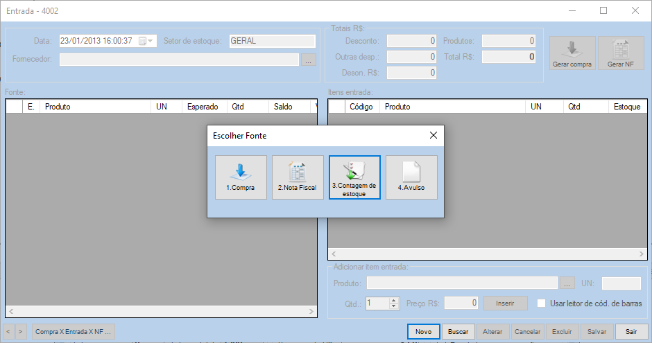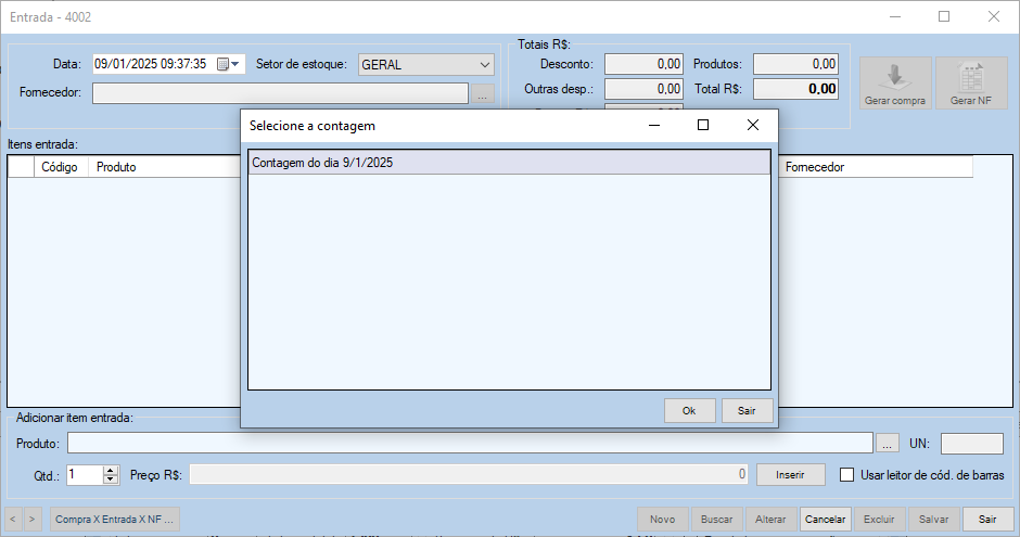 Observação: Os itens da contagem escolhida estarão listados no quadro “Itens entrada”.