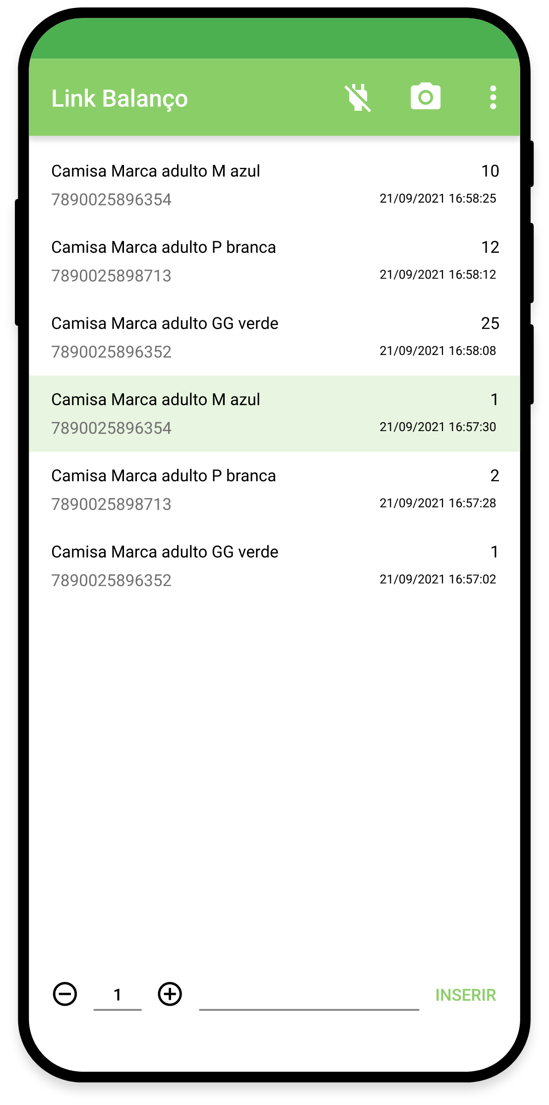 b. Pela câmera do dispositivo clicando no ícone de câmera. Ao abrir a câmera, informe a quantidade e, em seguida, aponte a câmera para o código de barras na embalagem do produto.