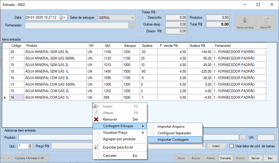 - Clique com o botão direito do mouse no quadro “Itens entrada”, escolha a opção Contagem Estoque > Importar Contagem.
