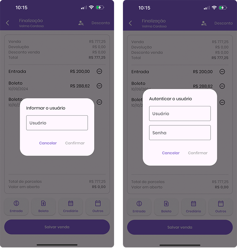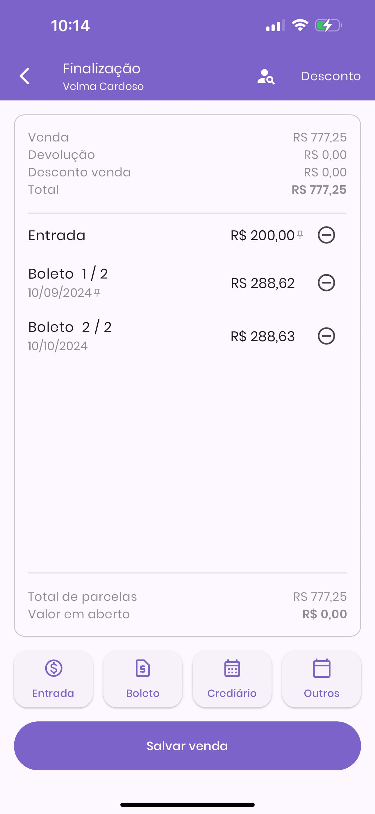d. Outros: Crediário e boleto. A forma será definida durante a finalização da venda no sistema Link.Podem ser adicionados descontos de “Valor” ou “Percentual” ao total do pedido através do botão Desconto no canto superior direito da tela.