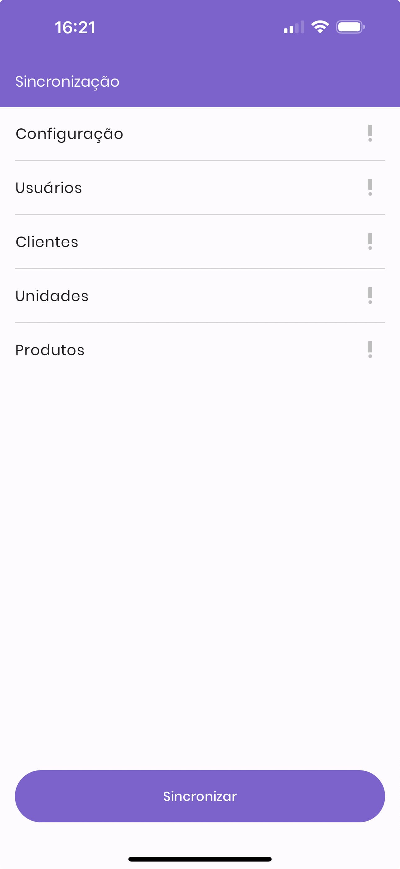 b. Sincronização: Onde é possível atualizar os cadastros do dispositivo com os dados mais recentes do sistema Link. Este procedimento é necessário caso haja novos cadastros, mudanças nos existentes e também alterações no estoque.