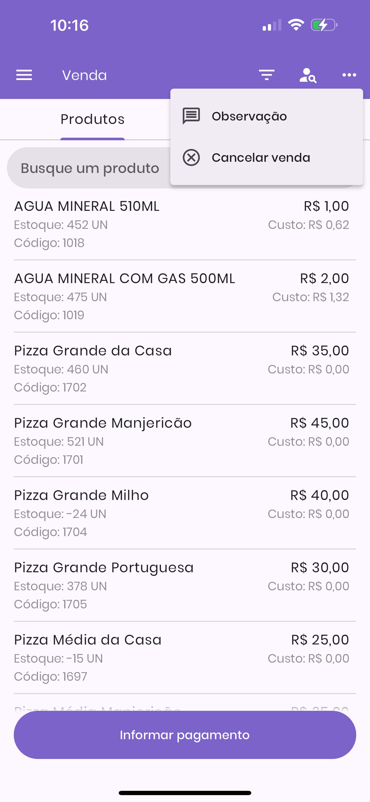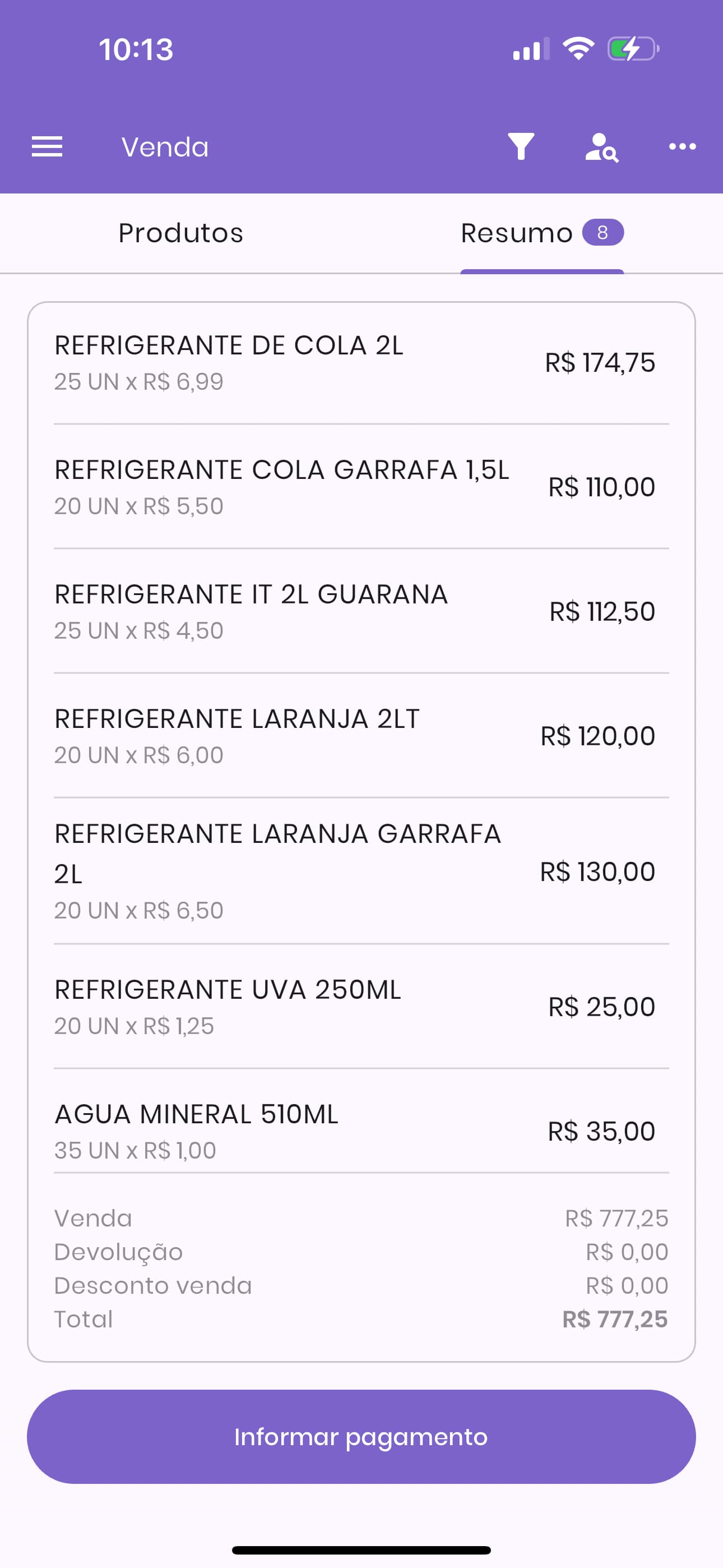 - Após realizar a adição de todos os itens ao pedido, clique em Informar pagamento.