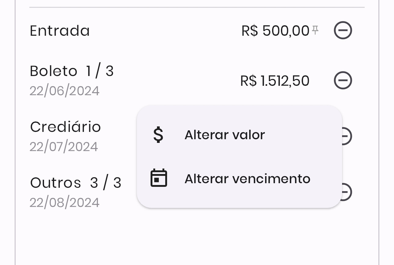 Ao clicar na forma de pagamento escolhida, é possível alterar o valor da parcela e o vencimento.