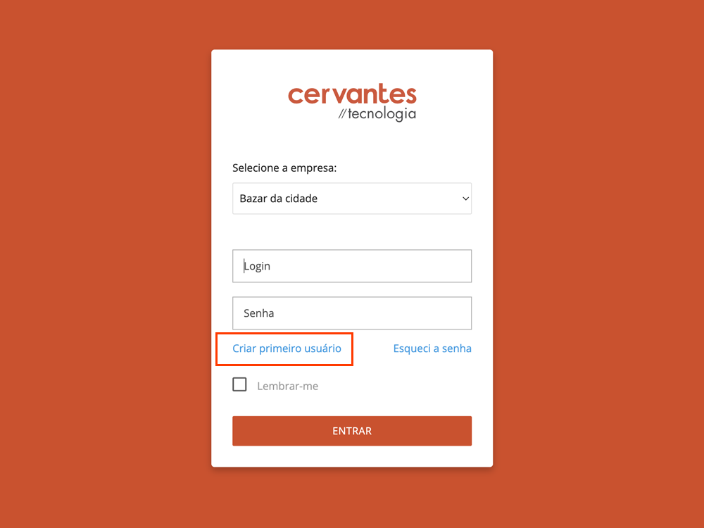 - Na tela de login, clique em Criar primeiro usuário.