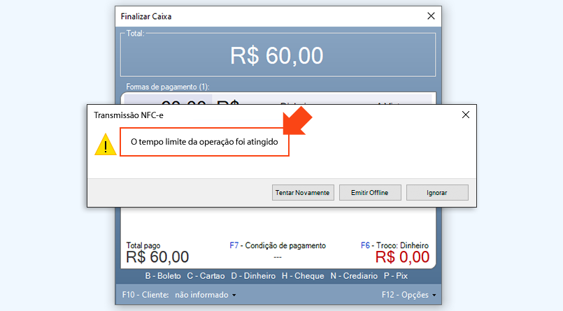 Solução: Clique no botão “Ignorar”. A venda será concluída e a Nota ficará no módulo de “Notas Fiscais Pendentes” localizado ao lado do relógio do seu Windows.