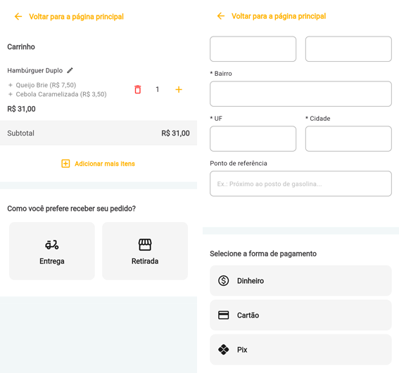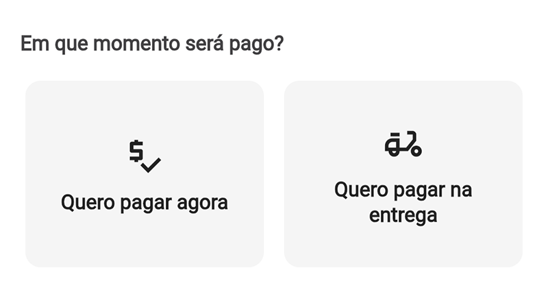 Considerando que todas estejam habilitadas, ao selecionar Cartão ou Pix será possível escolher entre Quero pagar agora ou Quero pagar na entrega/retirada.