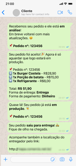 Notificação via WhatsApp : Com a função WhatsApp do Catálogo Online configurada, o consumidor receberá as atualizações do pedido direto pelo aplicativo WhatsApp.