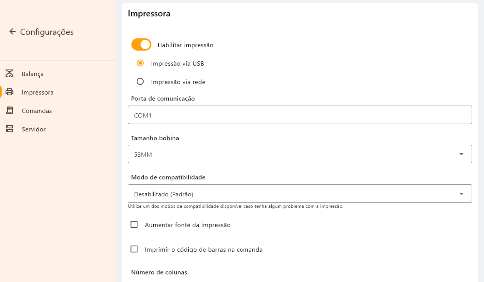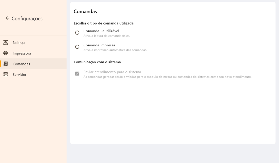Esta janela é para configurações de comandas impressas. Caso o seu estabelecimento utilize comandas reutilizáveis, não é necessário habilitar as configurações desta janela.