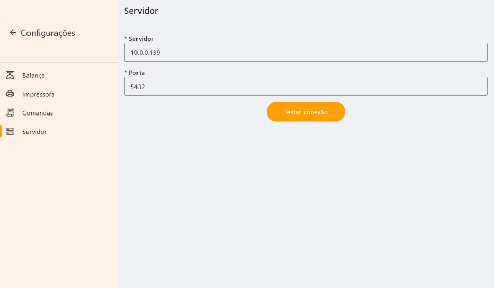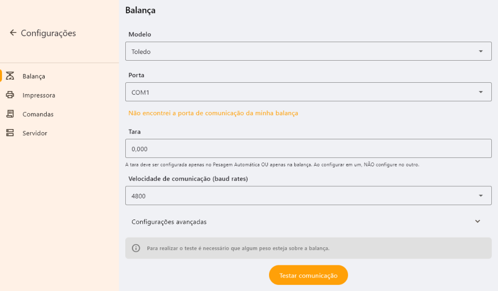 Para confirmar que as informações estão corretas, coloque um peso em cima da balança e clique em Testar comunicação.