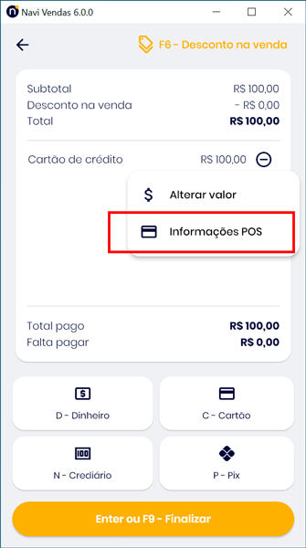 Observação: Caso precise alterar alguma das informações antes de finalizar a negociação, basta clicar sobre a forma de pagamento escolhida e no submenu selecionar a opção Informações POS.
